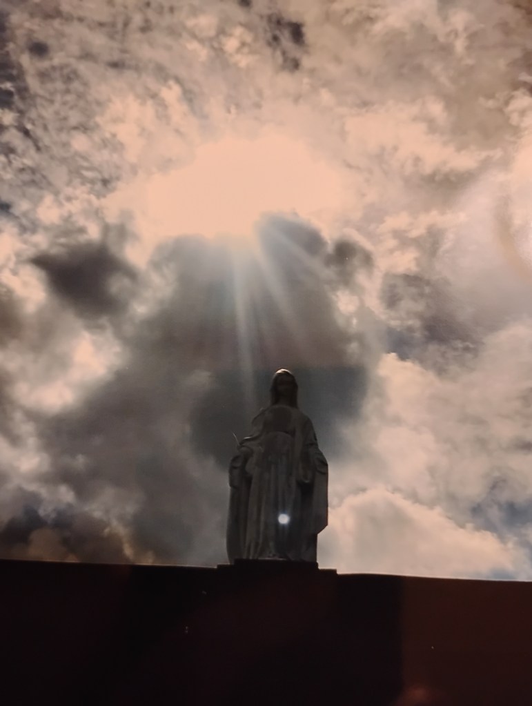 This picture taken on a summer visit during Covid. A storm was brewing. The clouds parted, but I did not see the “Host” in the series of photos I had taken, until I looked several days later. In the series of shots, the “Host” enters from the right until it comes into her center. Mary describes seeing the certain “Host” colors in your pictures to denote meanings. This is a photo of a photo, but the true color is purple. Purple means ‘passion.’ I was there after hearing of bad news.